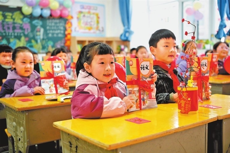 2月14日,在沁阳市朱载堉学校,一年级学生展示领到的新课本。当日是沁阳市新学期开学第一天,该市各学校多种形式迎开学,让学生快快乐乐开启新学期校园生活。杨帆 摄