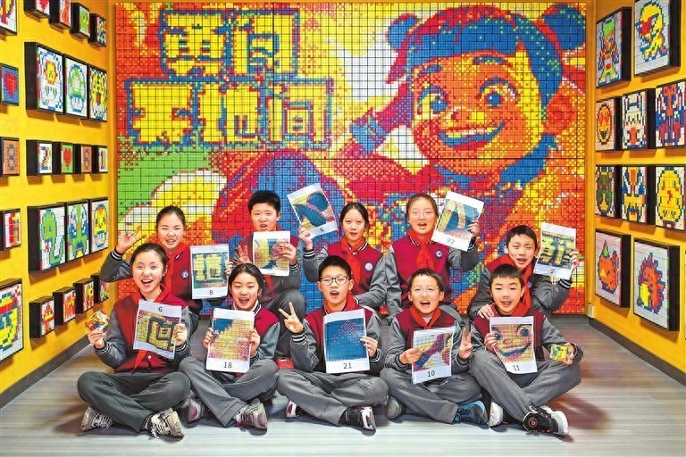 2月13日,洛阳市老城区第一小学36名师生利用2400个魔方,拼出了一面哪吒主题魔方墙,激励学子们新学期勇闯学海。李卫超 石智卫 摄